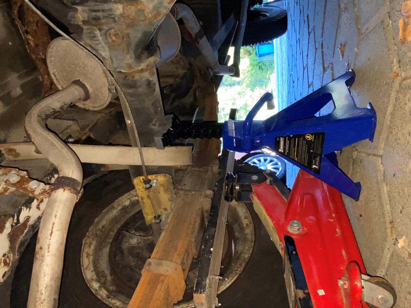 ich habe mir einen „Adapter“ zum Anheben meines S2a gebastelt. Er passt zwischen meinen Wagenheber und die „bottom plate for spring“. Das schien mir eine gute Stelle, um den Wagenheber anzusetzen. Vorher musste ein schlichtes Brett herhalten.