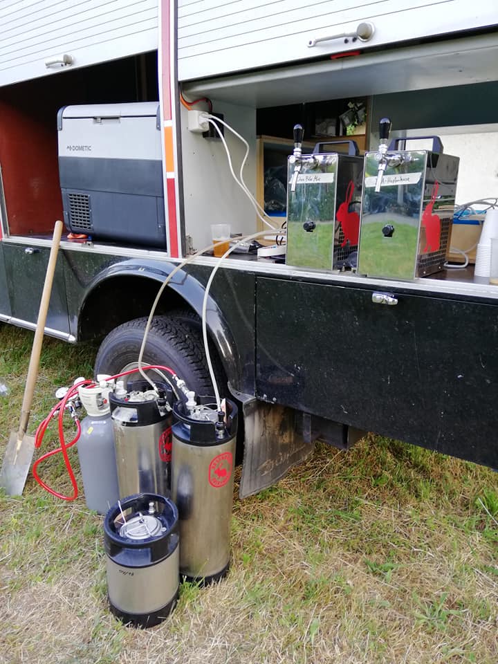 Da Flaschen ihrer gläsernen Eigenart auf Reisen sehr ungeeignet sind, drängt sich schell die Lösung mit der Fassversorgung auf. Der dazugehörige Zapfhahn mit Durchlaufkühler benötigt Energie: zB. 230 V, 50 Hz, 170 W, 1,16 A.